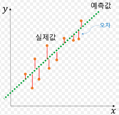 가장 적게 떨어져 있는(오차가 적은) 이상적인 선을 찾고자 하는 것이다.