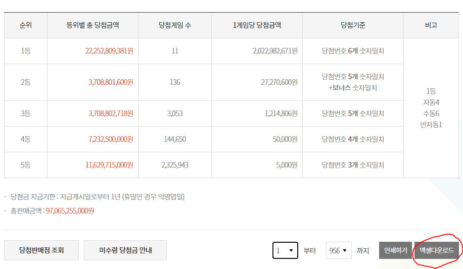원하는 회차부터 회차까지 당첨내역을 엑셀로 받을 수 있다.