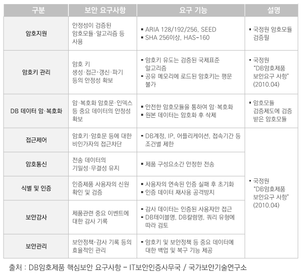 국가 정보원 IT보안인증 사무국에서는 DB암호화 제품 구축시