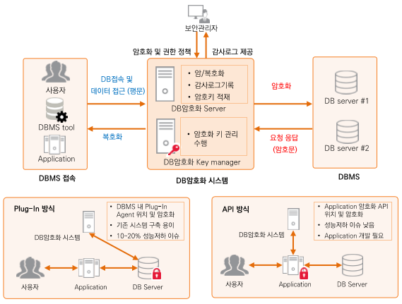 데이터 베이스 암호화 방식에는 API방식, 플러그인 방식,