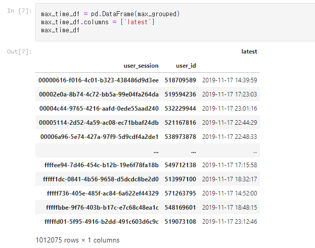 동일한 세션에 대해 가장 마지막(최대)의 시간을 값으로 하는 그룹과
