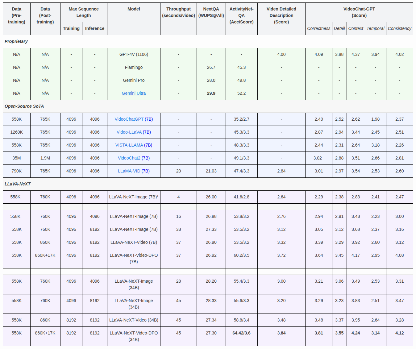 - LLaVA-NeXT-Video-DPO: DPO(Direct Preference Optimization)를 적용해 AI 피드백에 맞춘 응답 정렬을 수행함으로써 성능이 눈에 띄게 향상